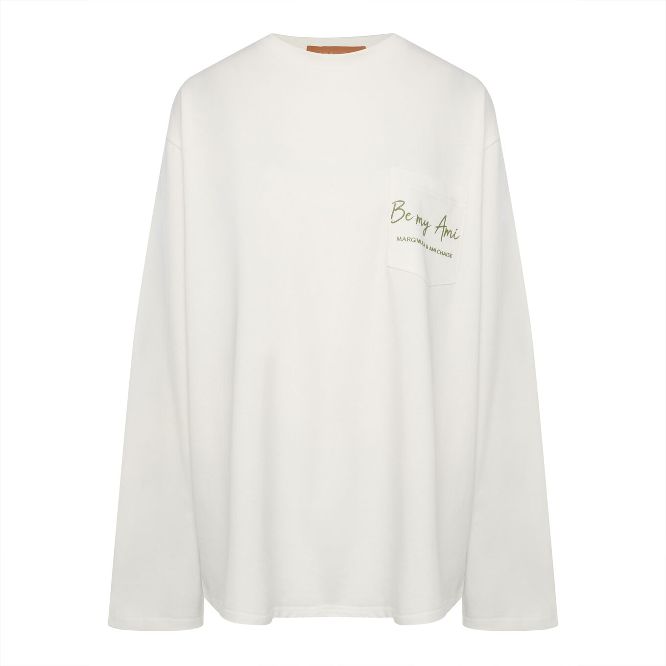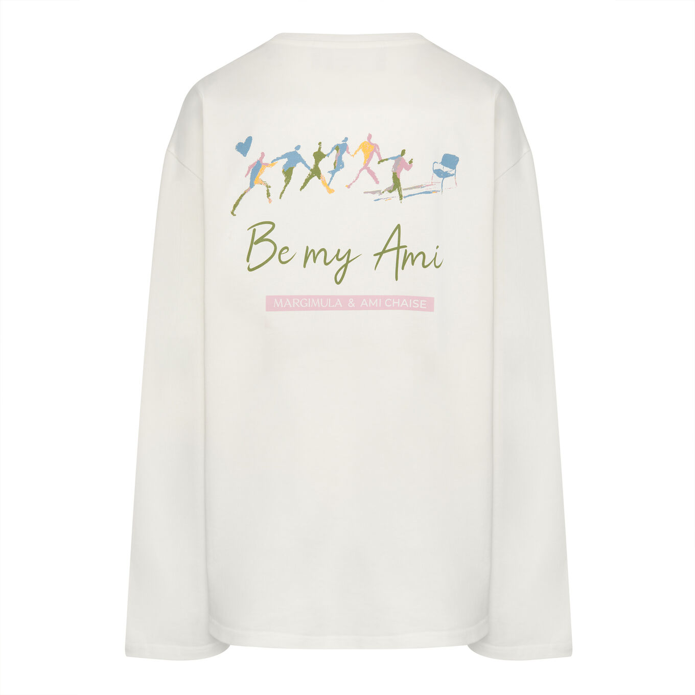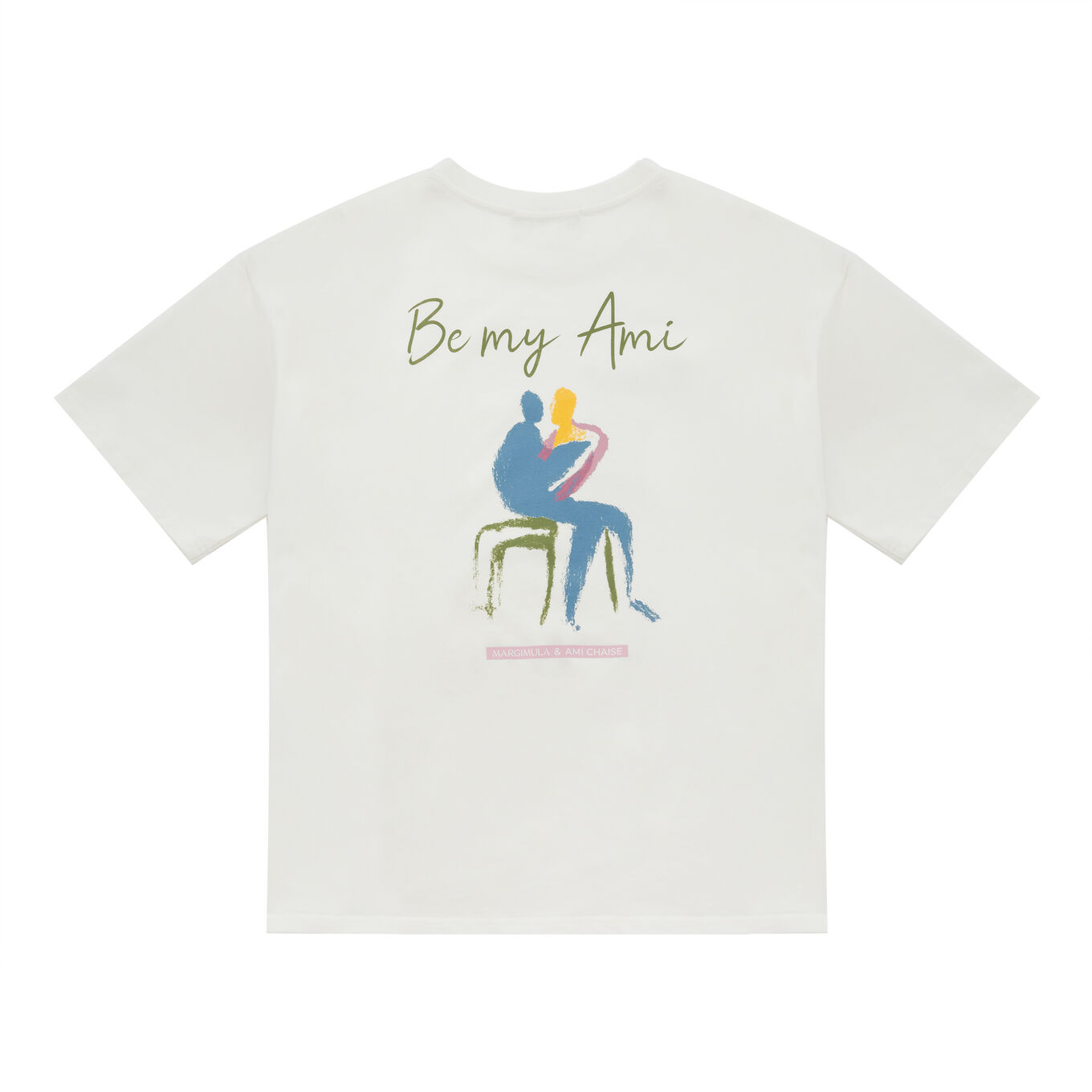 Сегодня с особым трепетом мы представляем вам капсулу мерча AMI CHAISE в коллаборации с независимым брендом Margimula. Две версии футболок и лонгсливов с надписью BE MY AMI — не просто одежда, а манифест близости, тепла и лёгкости новых встреч.